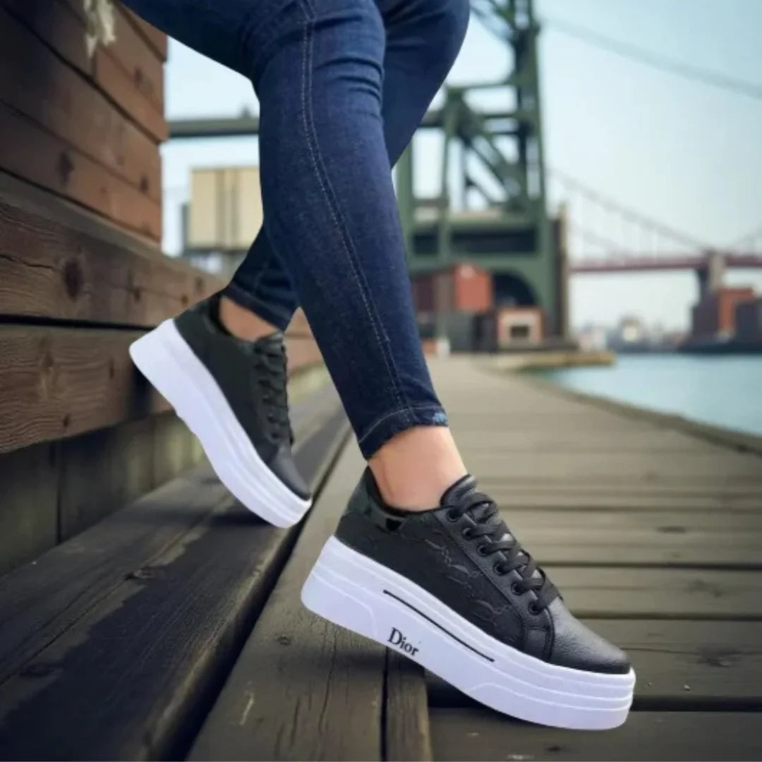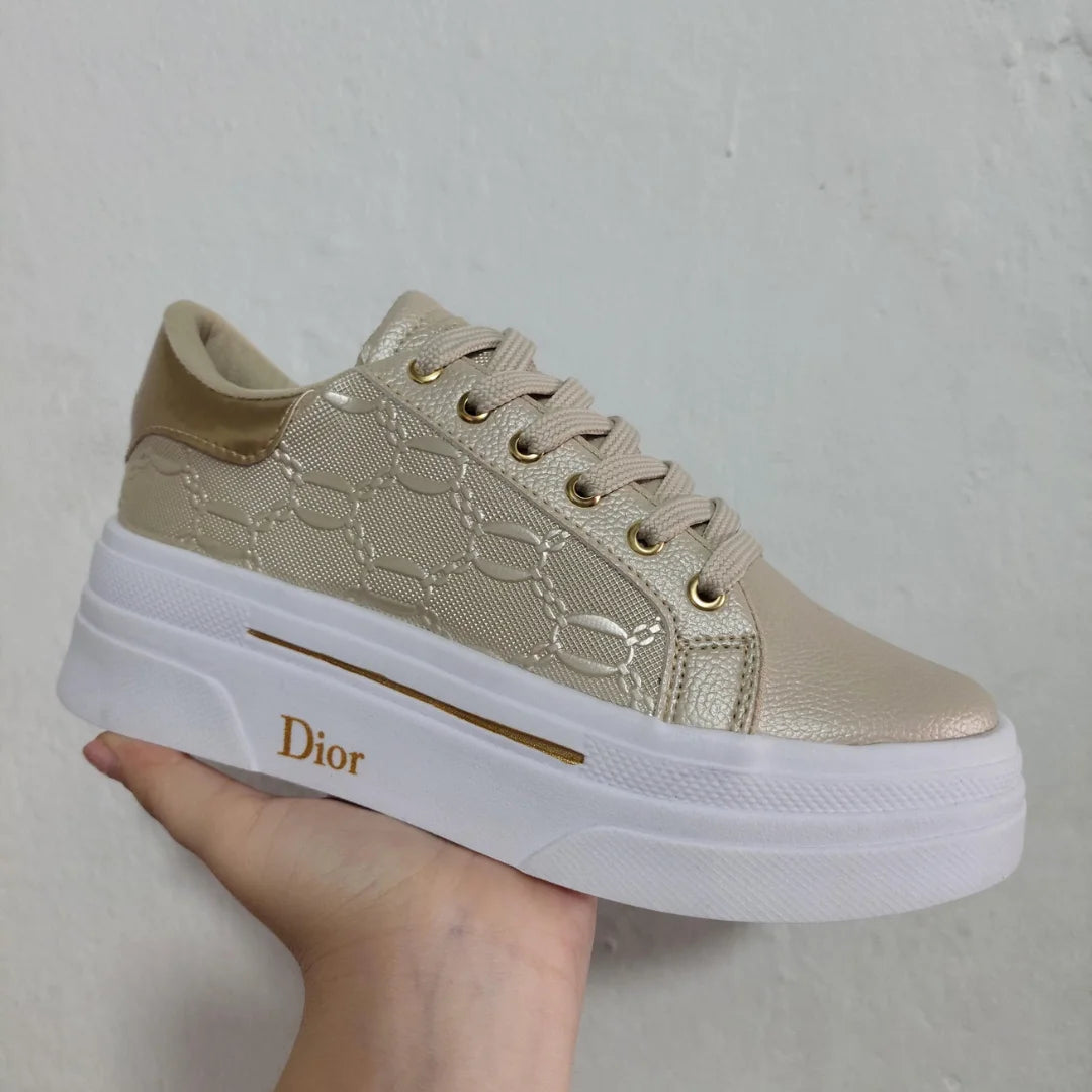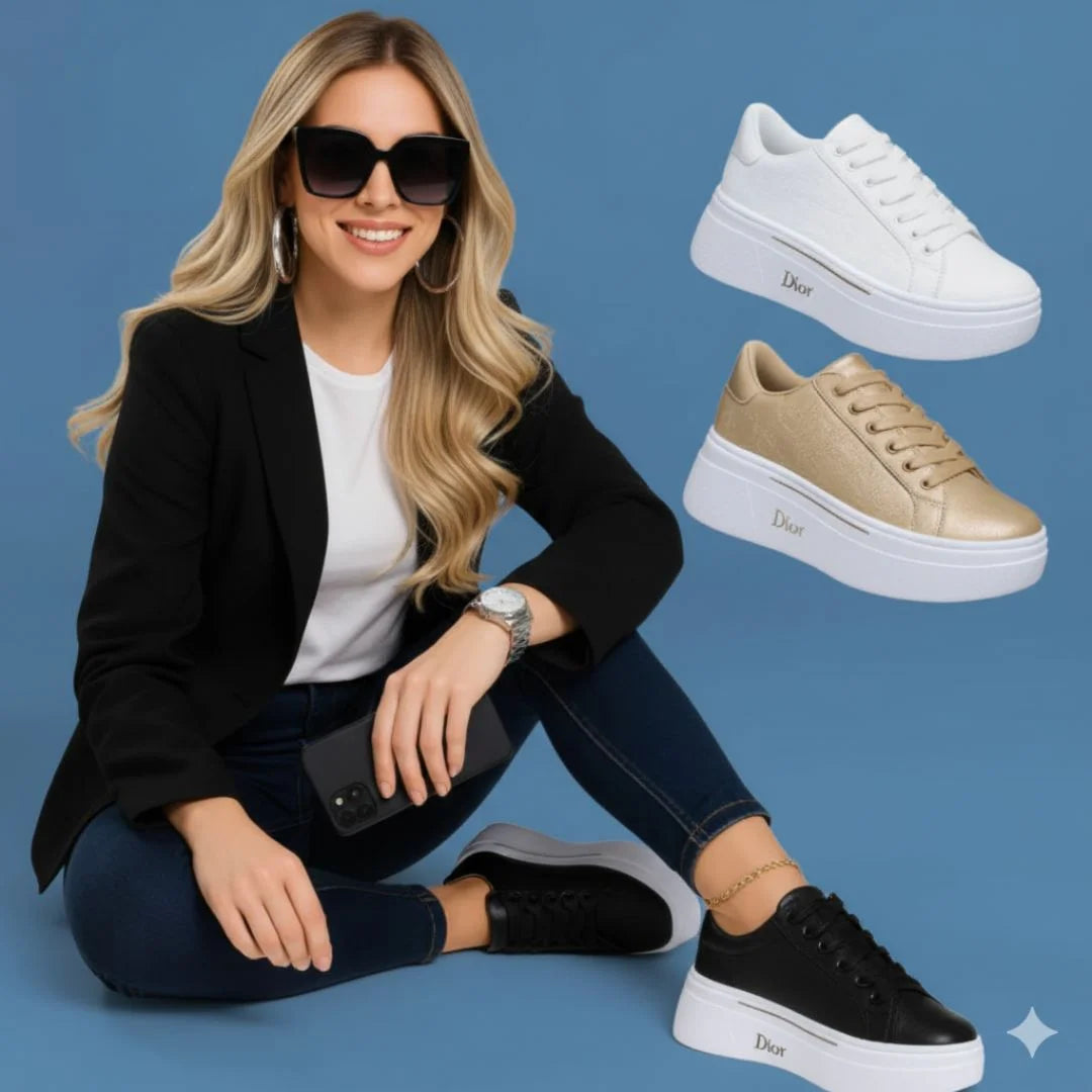 Con los Nuevo Tenis Suela Alta DIOR, obtienes estilo, altura y comodidad. Diseñados con cuero vegano, suela liviana y relieves de lujo, son el equilibrio perfecto entre lo chic y lo funcional.